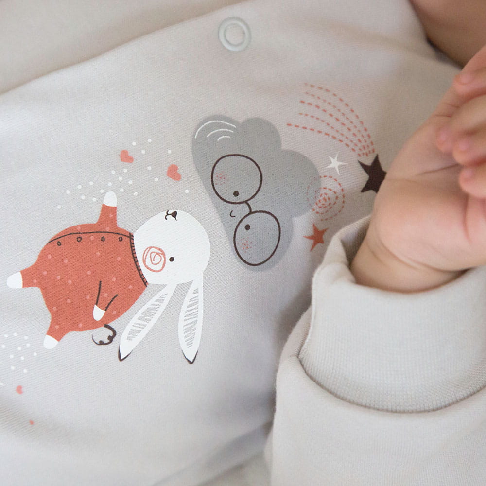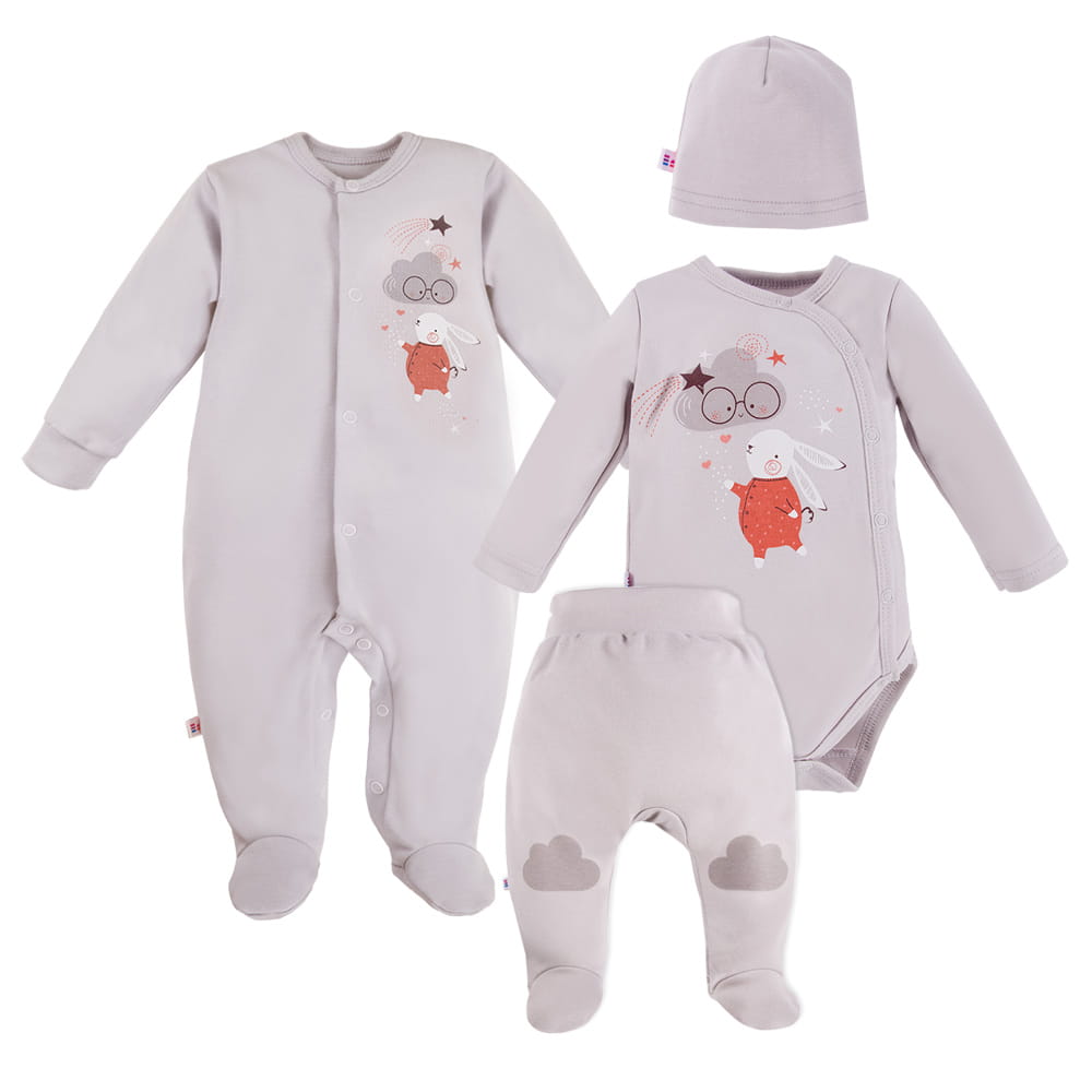 4-dílná výbava pro miminko z kolekce Mellow je ušita z měkké a příjemné bavlněné pleteniny, která zajišťuje pohodlí a bezpečí pro citlivou dětskou pokožku. Sada obsahuje: body, poloduhačky, dupačky a čepičku. Dekorační prvky sady obsahují roztomilé motivy: zajíček na body a dupačkách, mraky na poloduhačkách, a hladká čepička.
