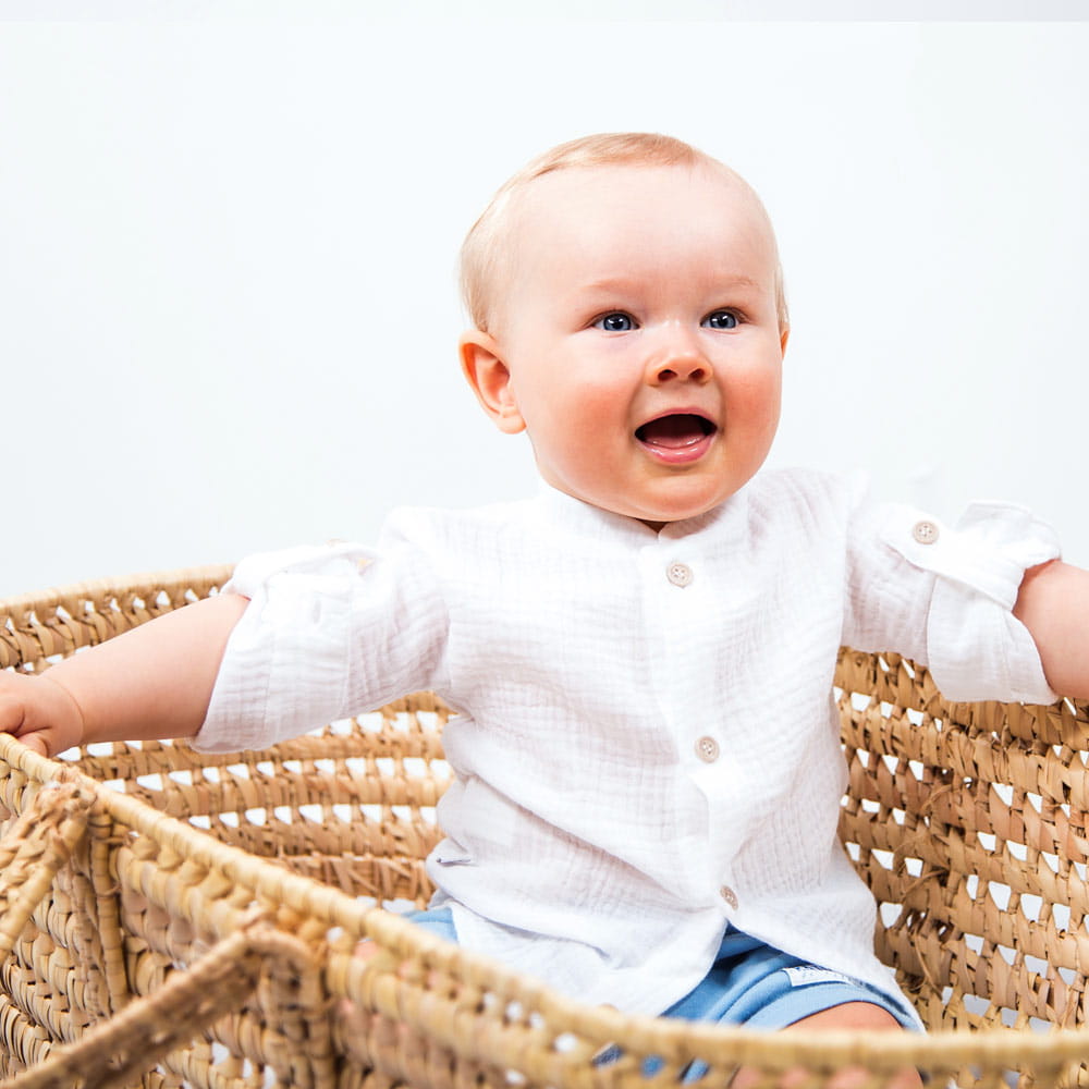 Košile je vyrobena ze 100% kvalitní bavlny ve formě lehkého a prodyšného mušelínu. Materiál je měkký, příjemný na dotek a šetrný k dětské pokožce.