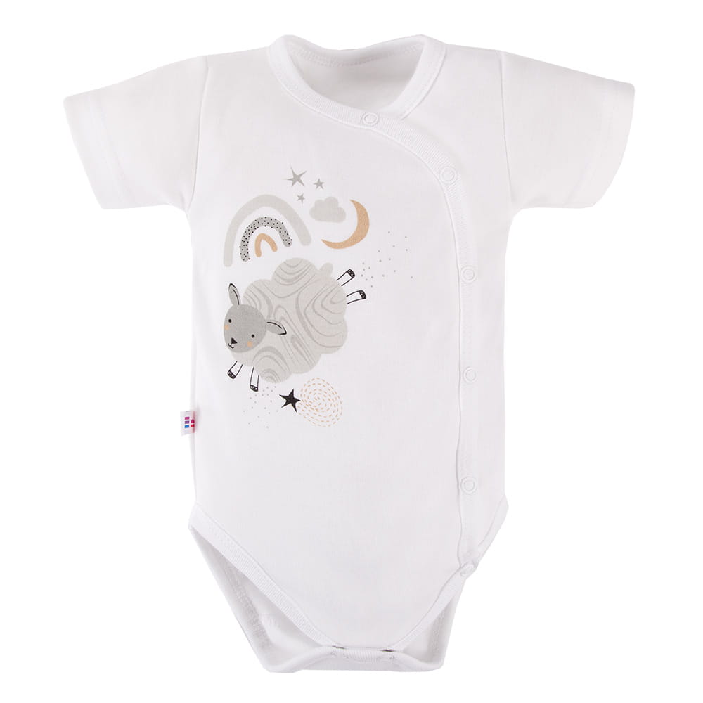 Dětské body s krátkým rukávem z kolekce Mellow v bílé barvě je vyrobeno z měkké, příjemné bavlněné pleteniny, která zajišťuje pohodlí a bezpečí pro jemnou dětskou pokožku. Na přední straně body se nachází roztomilý motiv ovečky, který dodává celku jemný a dětský vzhled.