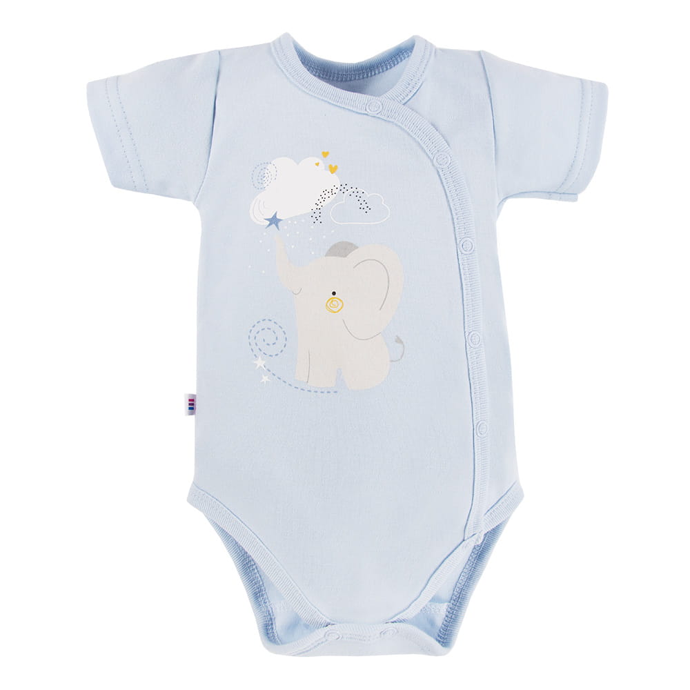 Dětské body s krátkým rukávem z kolekce Mellow v modré barvě je vyrobeno z měkké, příjemné bavlněné pleteniny, která zajišťuje pohodlí a bezpečí pro jemnou dětskou pokožku. Na přední straně body se nachází roztomilý motiv slona, který dodává celku jemný a dětský vzhled.