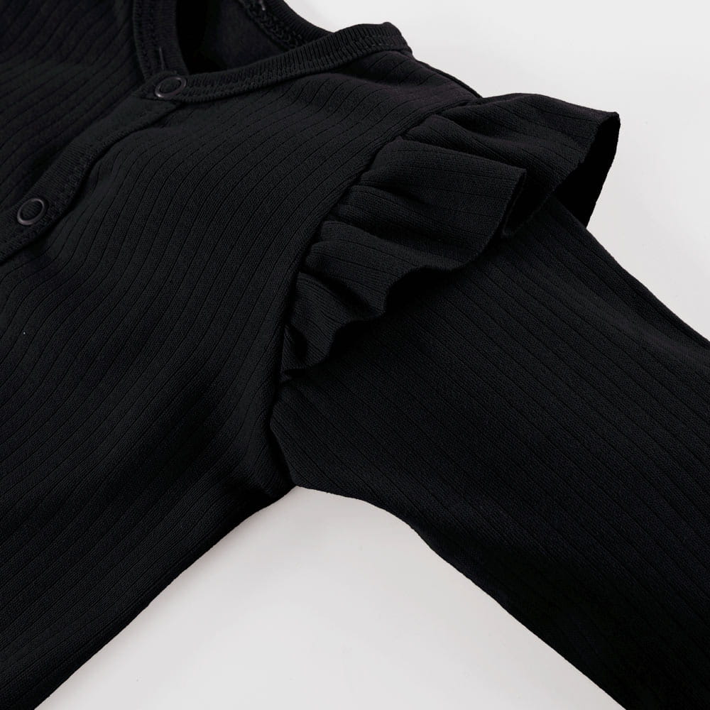 Zavinovací kojenecké body s volánkem z kolekce Simply Comfy v elegantní černé barvě je stylovou a pohodlnou volbou pro každodenní nošení. Jemný volánek dodává body moderní a jemný vzhled.