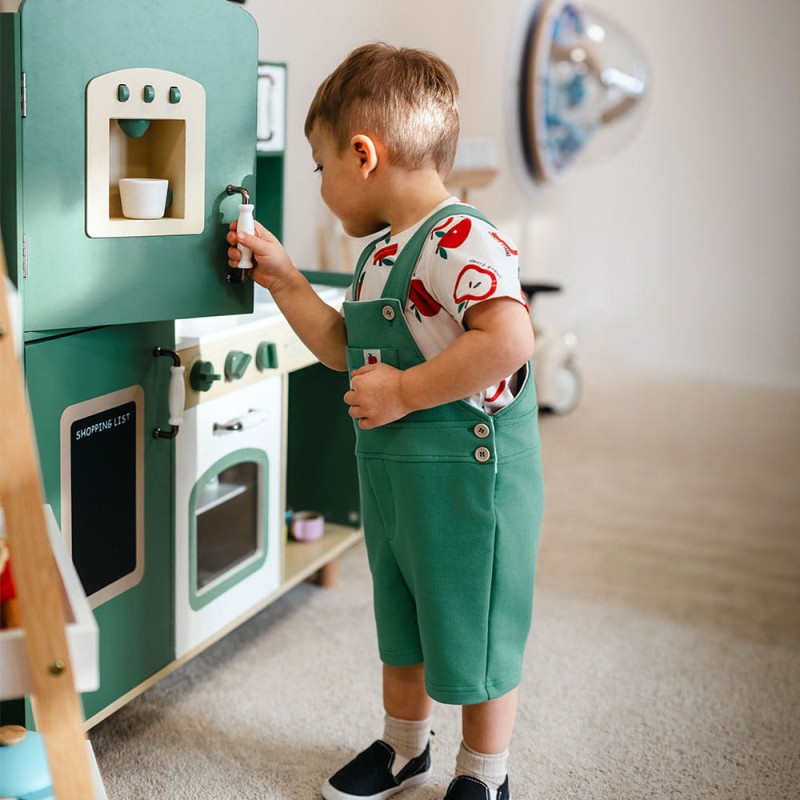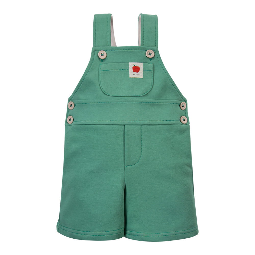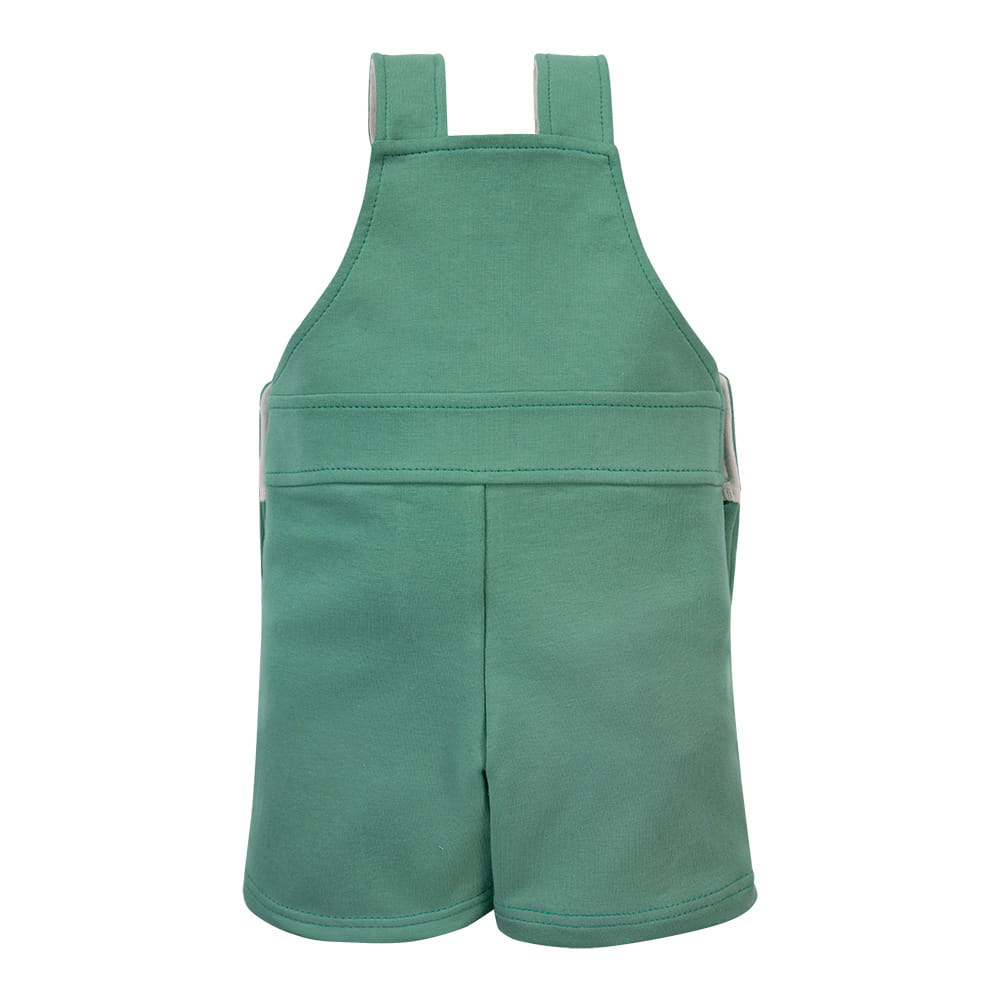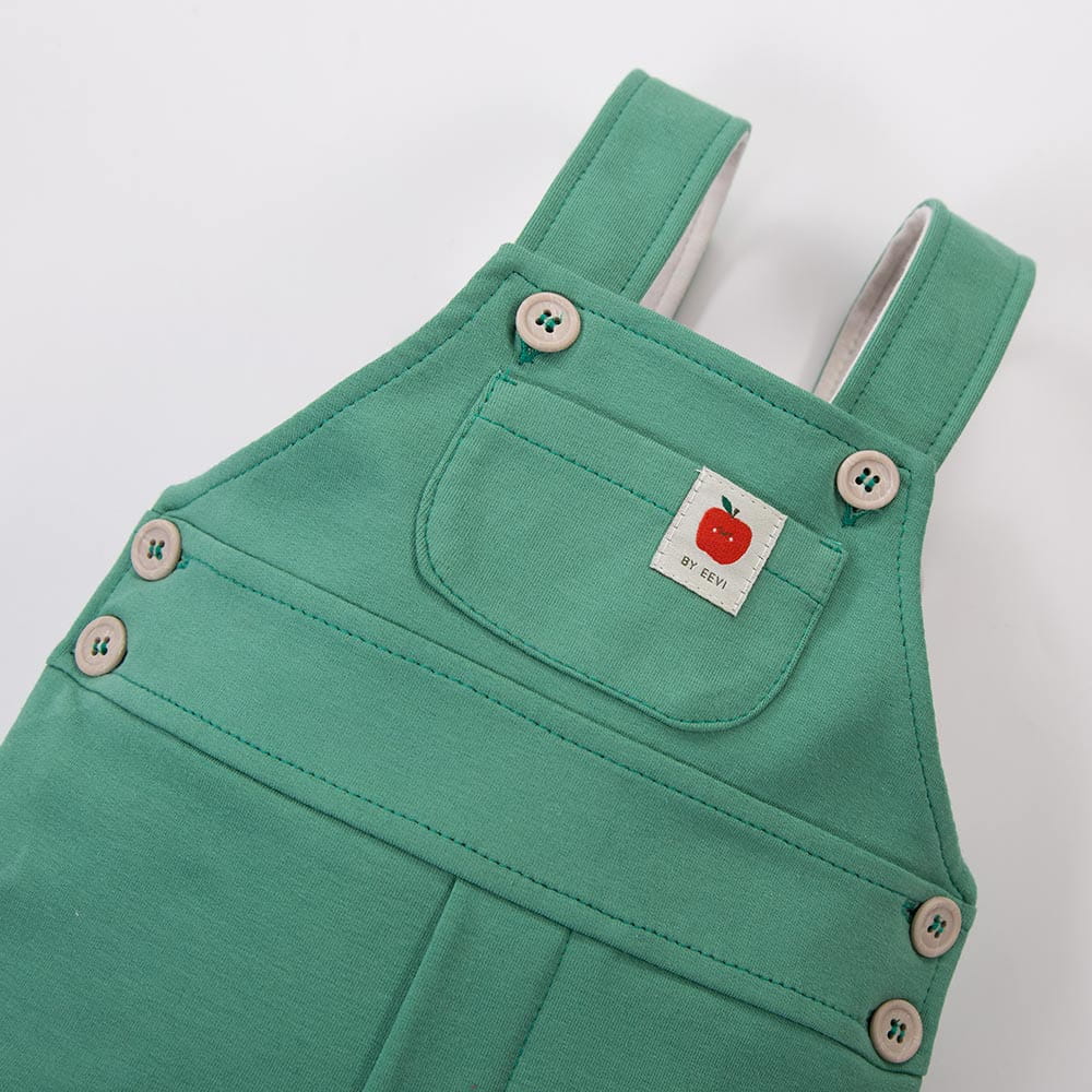 Měkké a pohodlné lacláče pro chlapce vyrobené ze 100% přírodní, měkké bavlny. Lacláče mají zelenou barvu a praktickou přední kapsu s nášivkou jablíčka. Knoflíky jsou umístěny na ramínkách a po stranách, což usnadňuje oblékání a přizpůsobení. Ideální na každodenní nošení a hry venku.