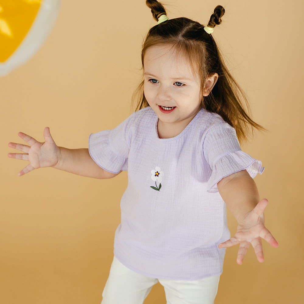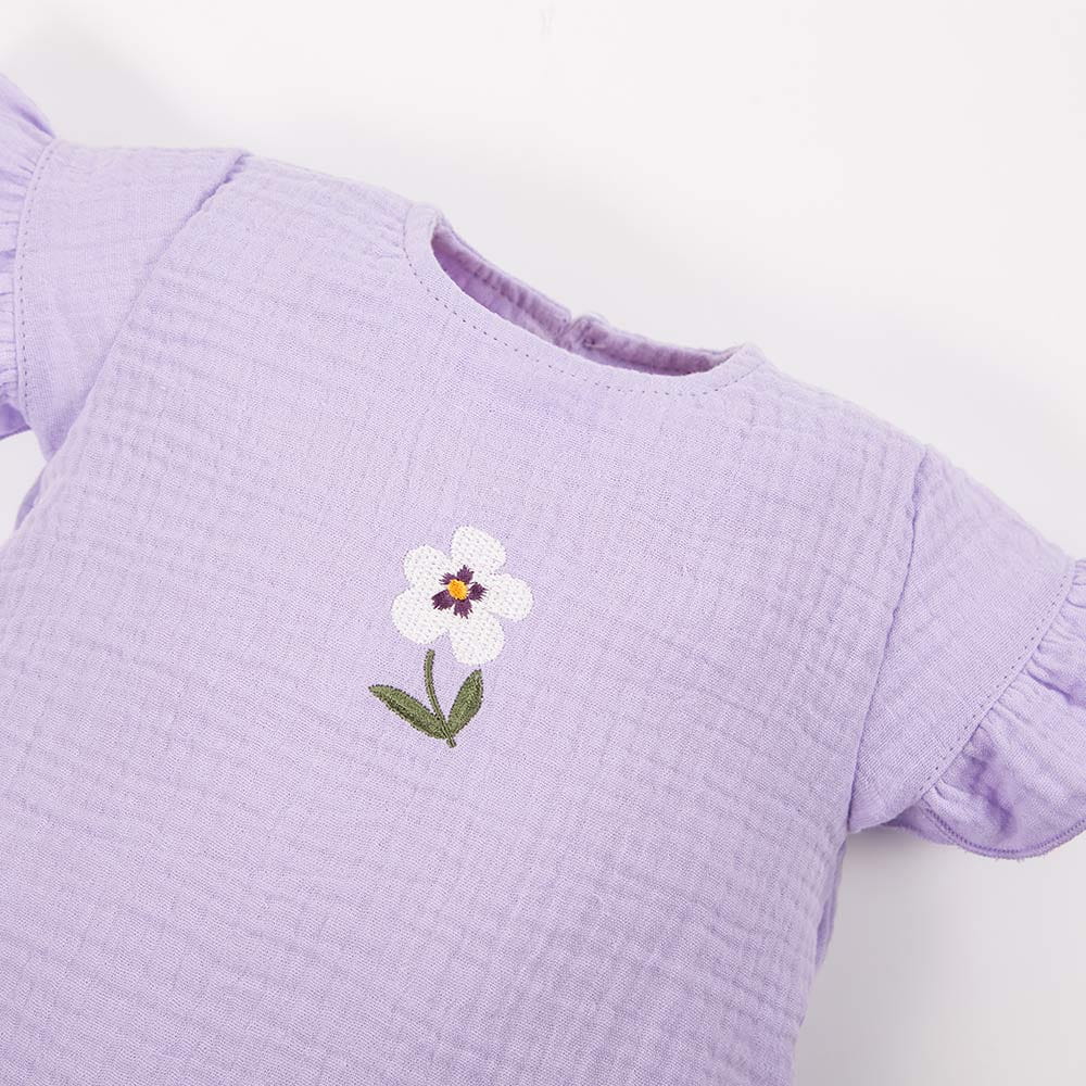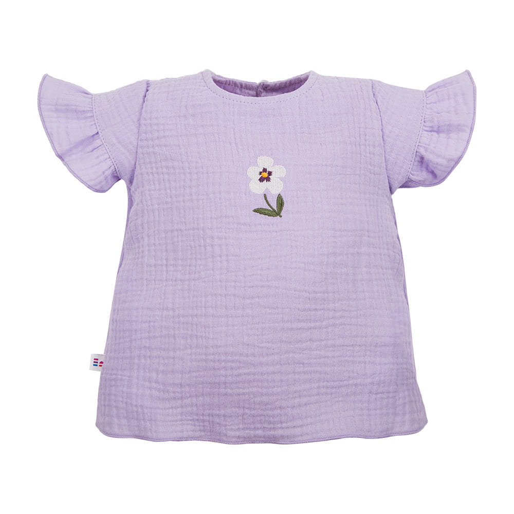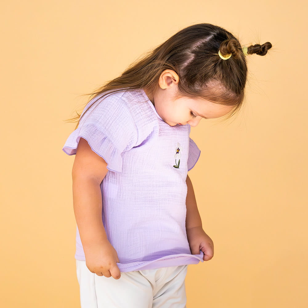 Dětská mušelínová halenka s krátkým rukávem a volány, fialová