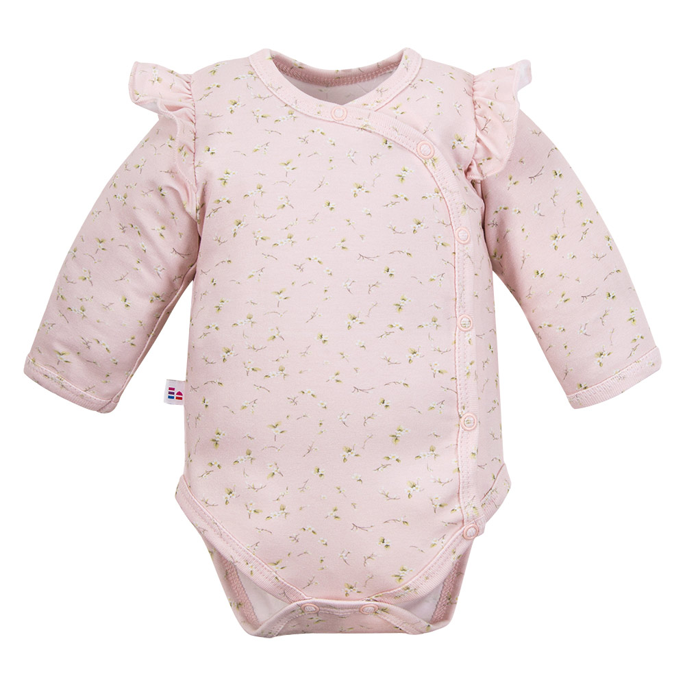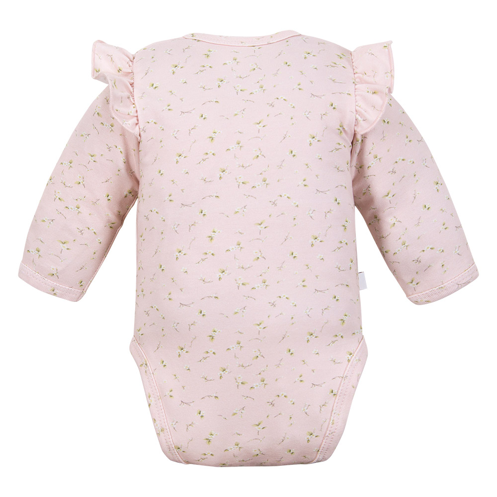 Body má dlouhé rukávy a jemný růžový vzor s drobnými bílými kvítky, který mu dodává něžný holčičí vzhled. Boční ozdobné volánky přidávají celkovému designu kouzlo.