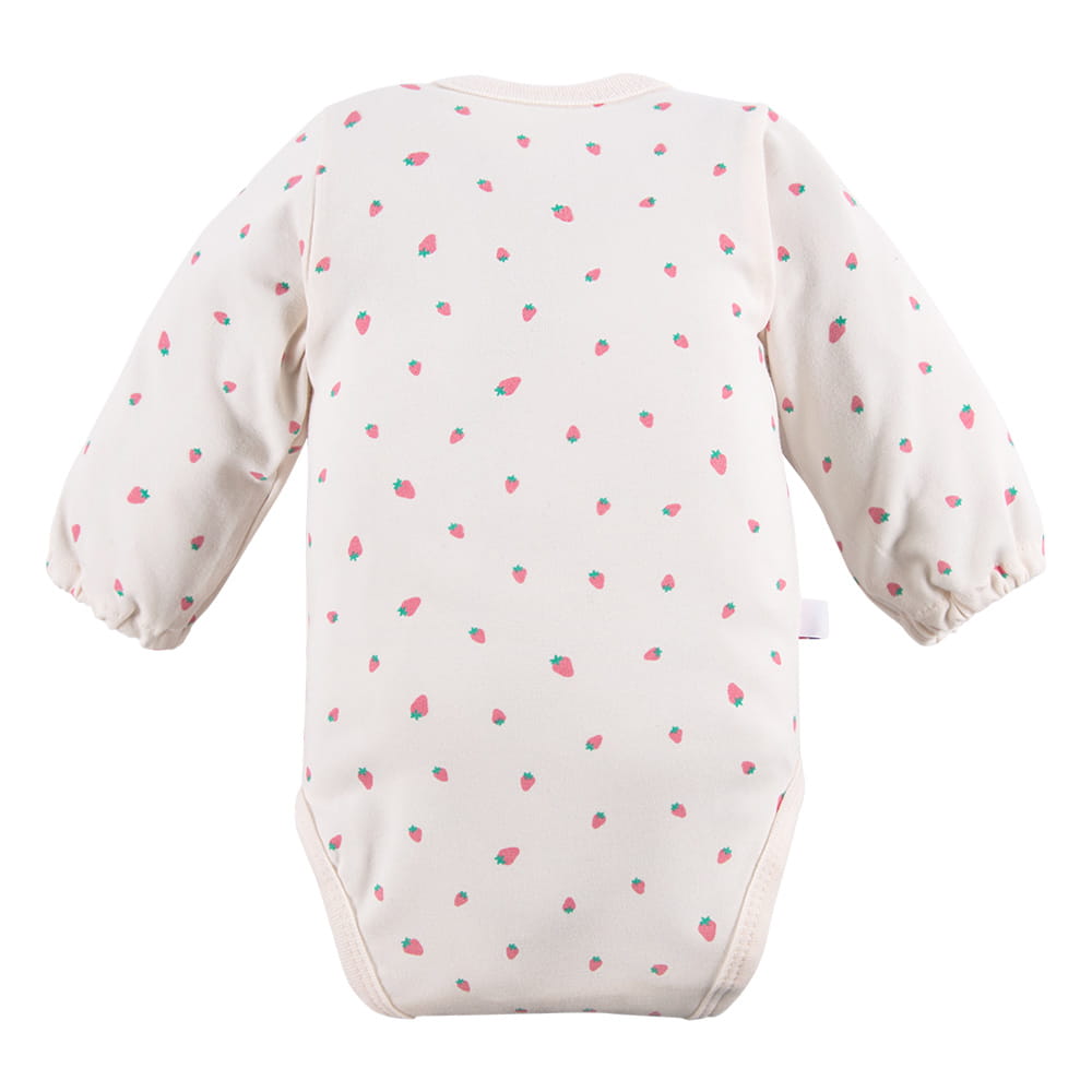 Dětské body v barvě ecru s dlouhým rukávem a jahodovým vzorem