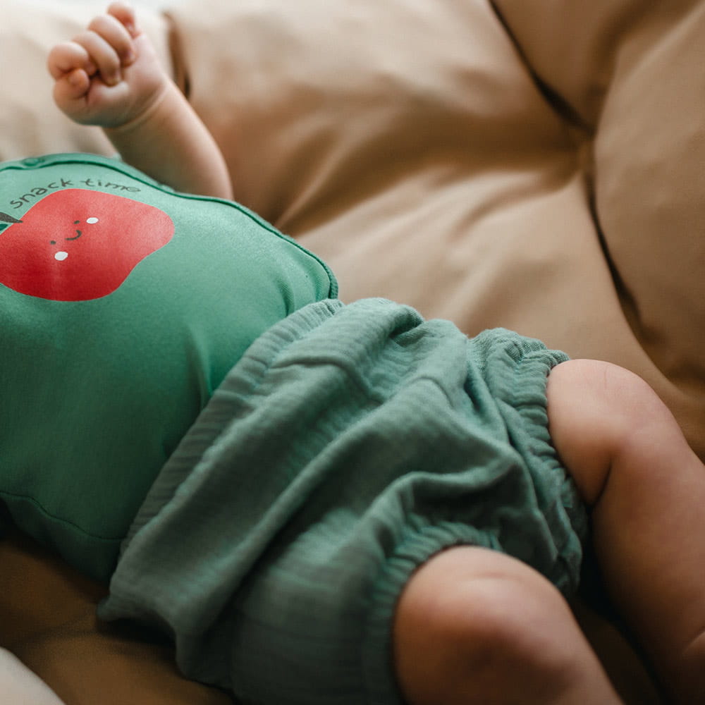 Dětské mušelínové bloomers zelené – kolekce Snack Time