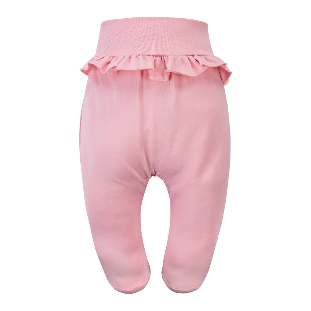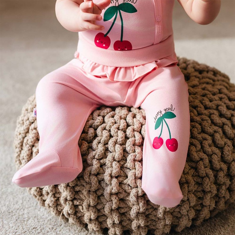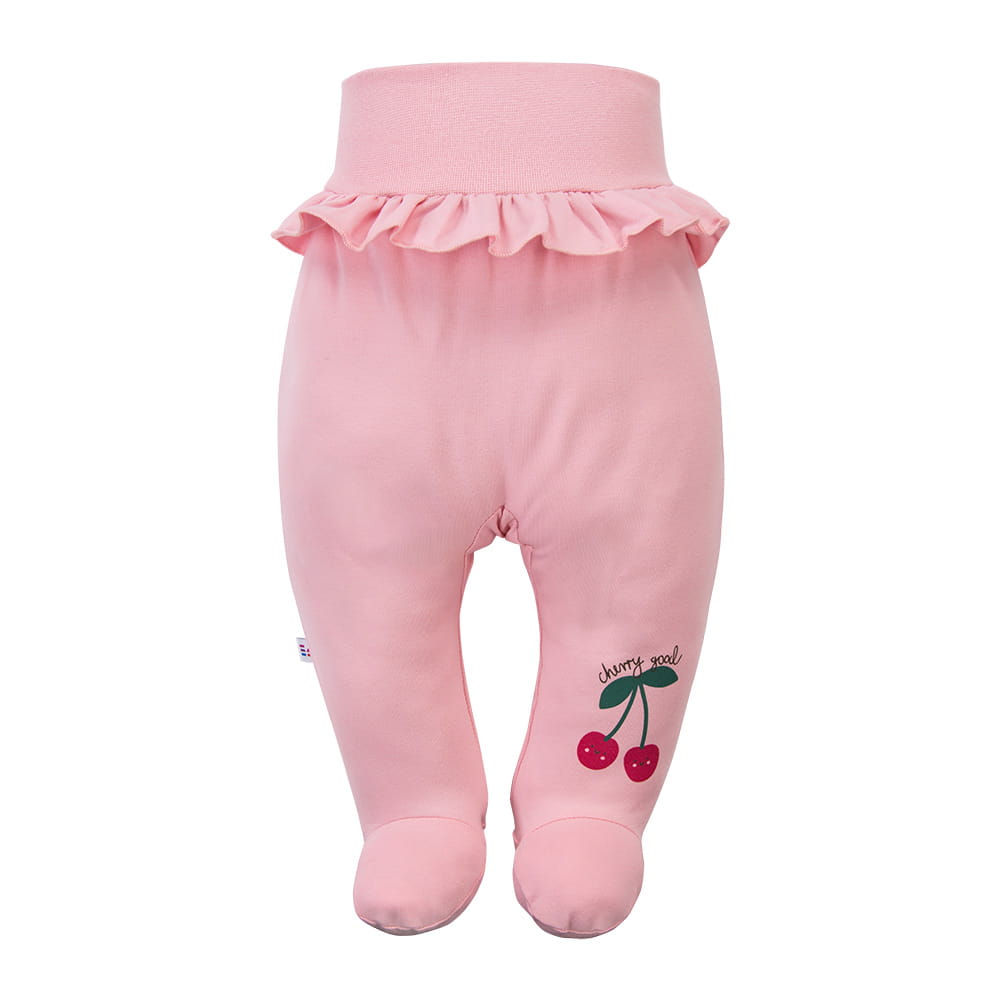 Měkké a pohodlné polodupačky pro kojence vyrobené z materiálu obsahujícího 95% bavlny a 5% elastanu. Polodupačky jsou světle růžové, zdobené roztomilým potiskem třešní. Na horní části je vsazen jemný volánek, který jim dodává dívčí charakter. Měkký a elastický materiál zajišťuje pohodlí a volnost pohybu při každodenních aktivitách dítěte.