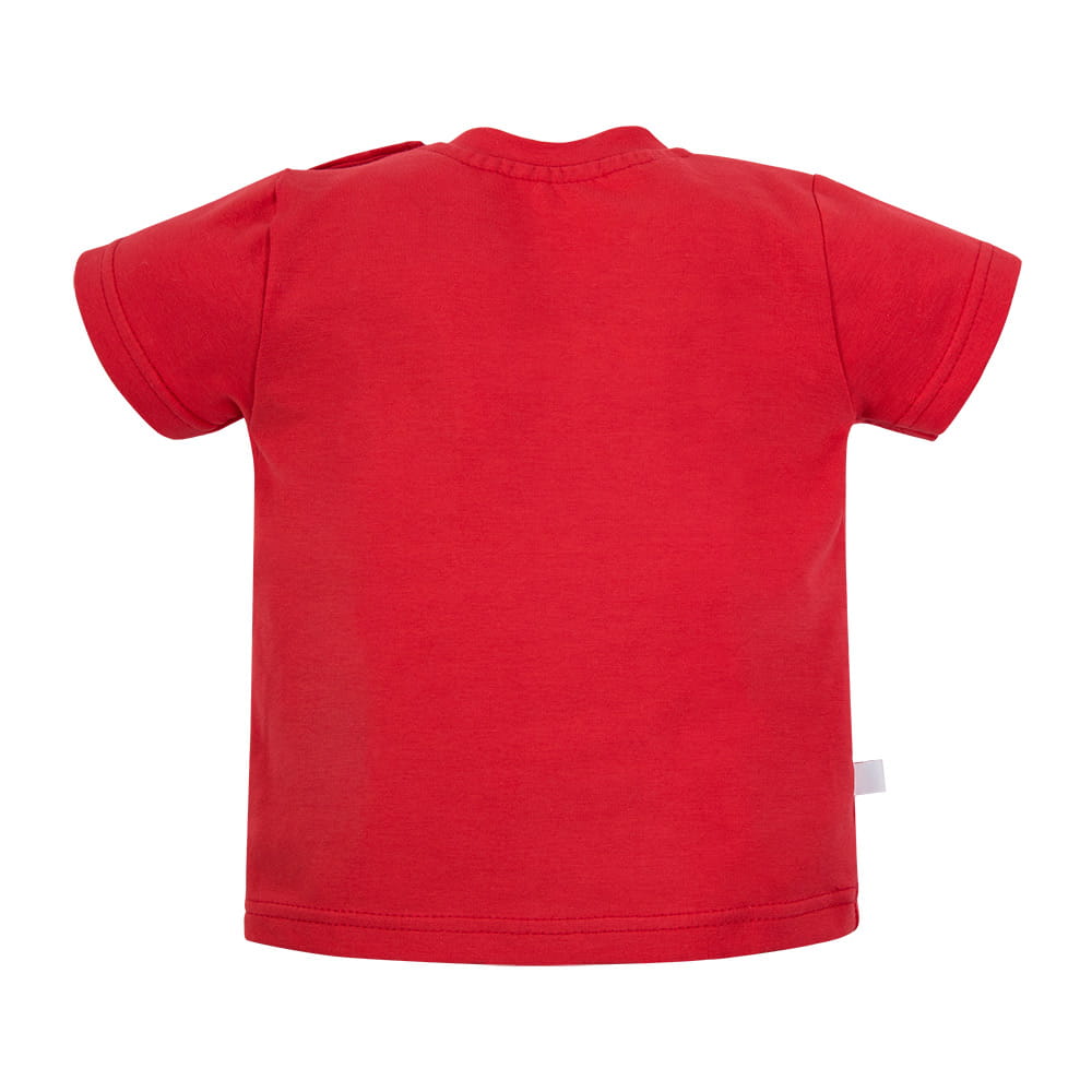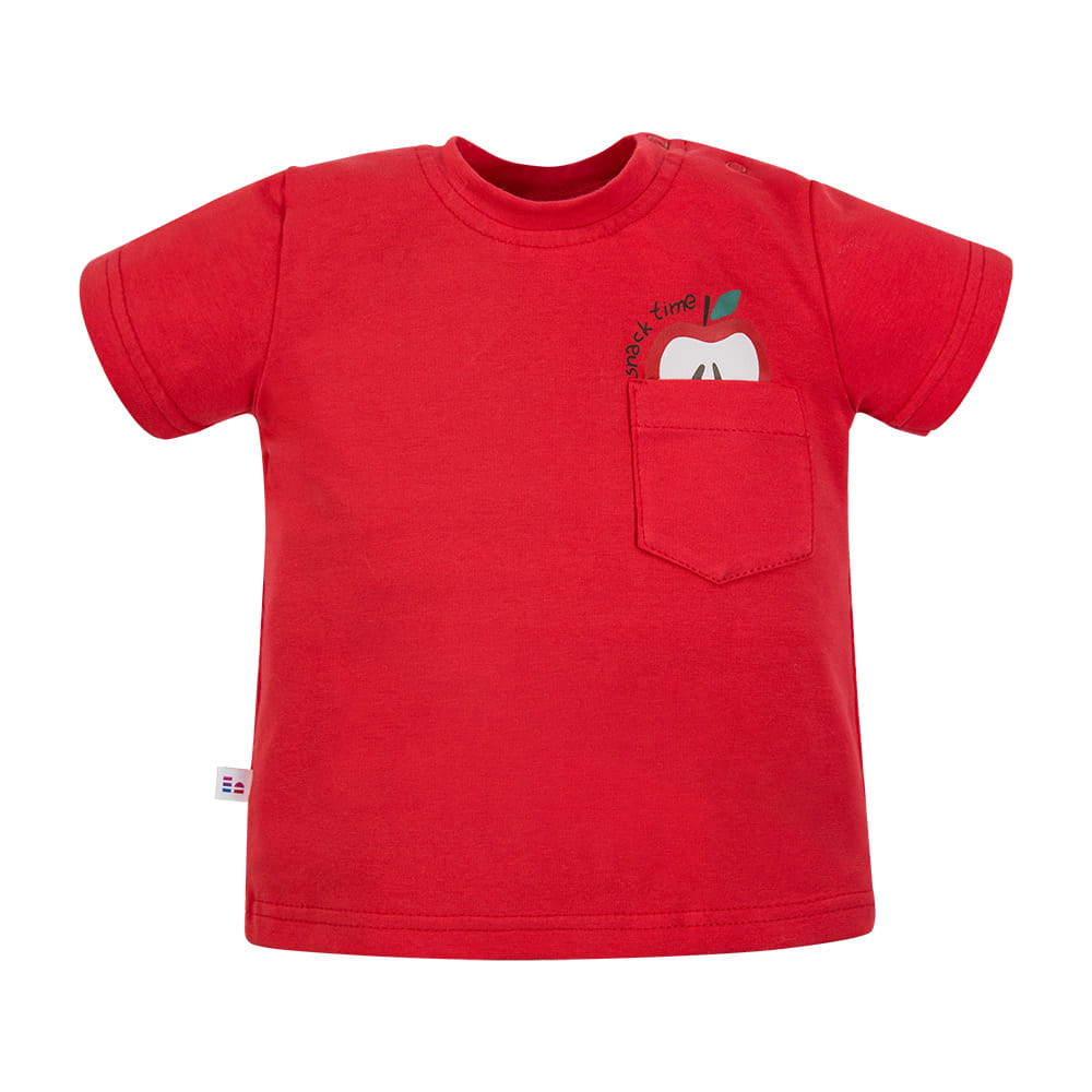 Červené dětské tričko z kolekce Snack Time je pohodlnou a stylovou volbou pro každodenní nošení. Tričko v sytě červené barvě má na boku malou kapsičku, ze které vykukuje motiv jablíčka, což mu dodává hravý dětský vzhled.