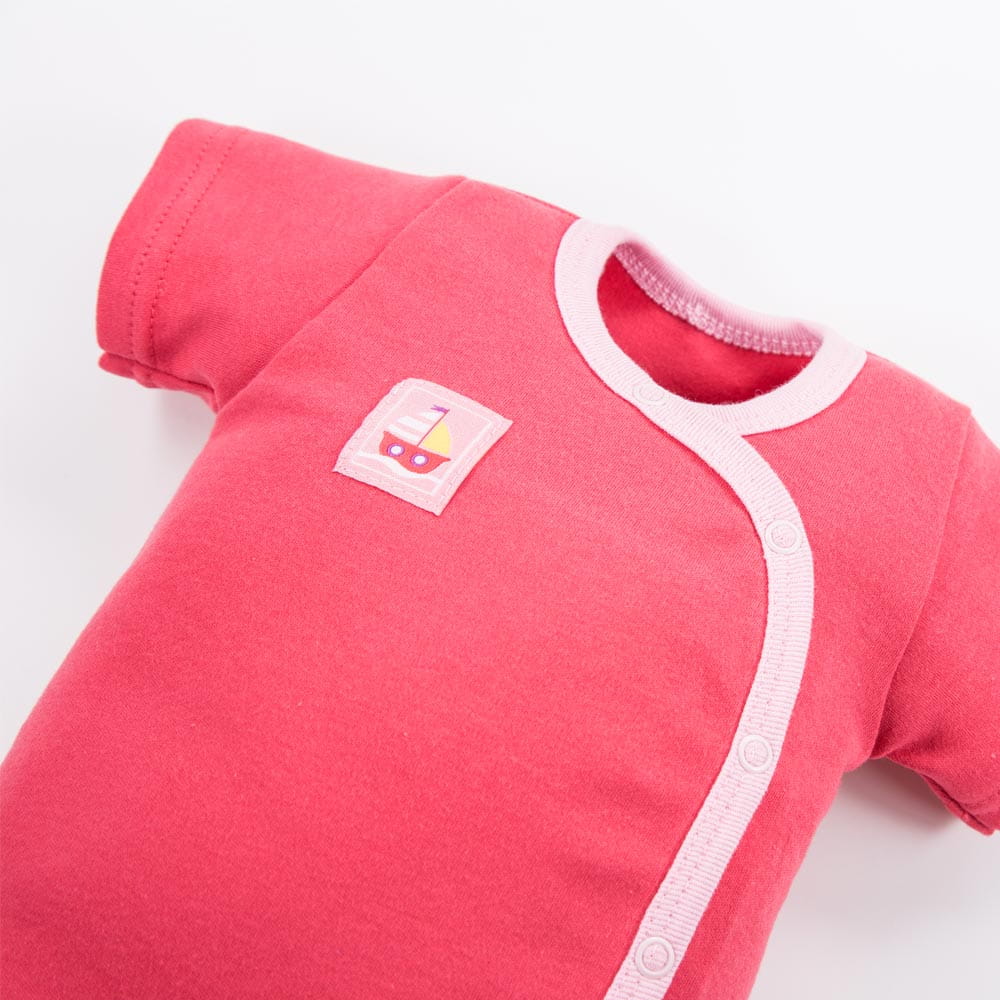 Dětské zavinovací body malinové barvy s růžovou lemovkou