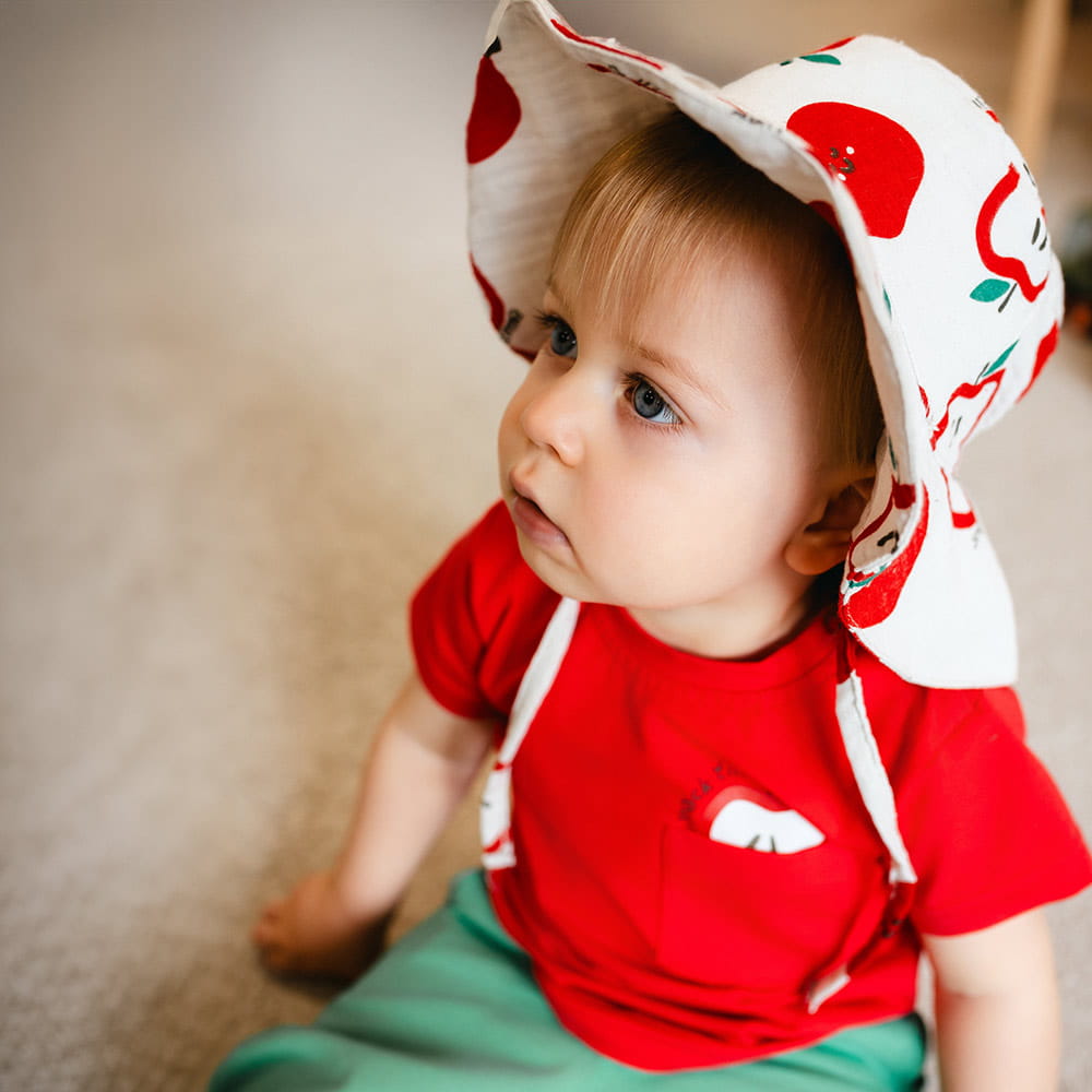 Měkký a prodyšný klobouk pro děti vyrobený ze 100% přírodního, měkkého bavlněného mušelínu. Klobouk má jemnou ecru barvu ozdobenou roztomilým potiskem jablíček a váže se pod bradou, což zajišťuje pohodlí a bezpečí při nošení. Ideální na jaro a léto, poskytuje ochranu před sluncem a komfort při hře venku.
