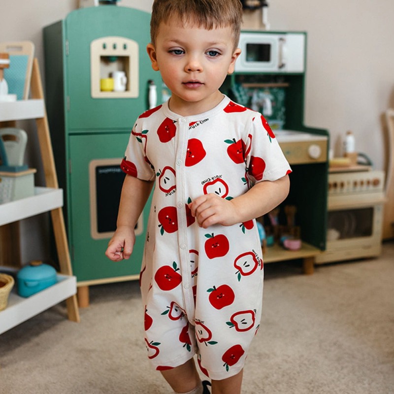 Měkký a pohodlný rampers pro děti vyrobený z pleteniny obsahující 95 % bavlny a 5 % elastanu. Rampers má barvu ecru s roztomilými jablíčky, krátké rukávy a krátké nohavice, díky čemuž je ideální volbou na teplé letní dny a prázdninové výlety. Měkký a elastický materiál zajišťuje pohodlí a volnost pohybu při každodenním hraní.