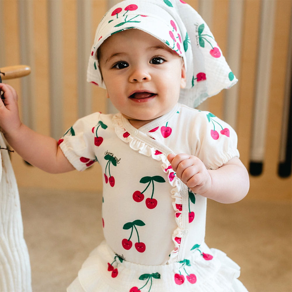 Měkké a pohodlné body pro dívky vyrobené z pleteniny obsahující 95% bavlny a 5% elastanu. Body má krátké rukávy a světle ecru barvu zdobenou roztomilým potiskem třešní. Uprostřed je jemná volánka, která mu dodává dívčí a jemný charakter. Ideální na léto a prázdninové cesty – zajišťuje pohodlí a volnost pohybu během každodenní hry a aktivit venku.