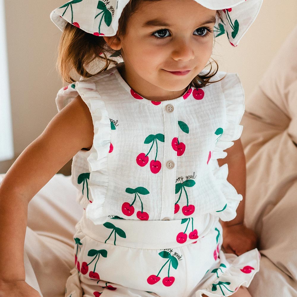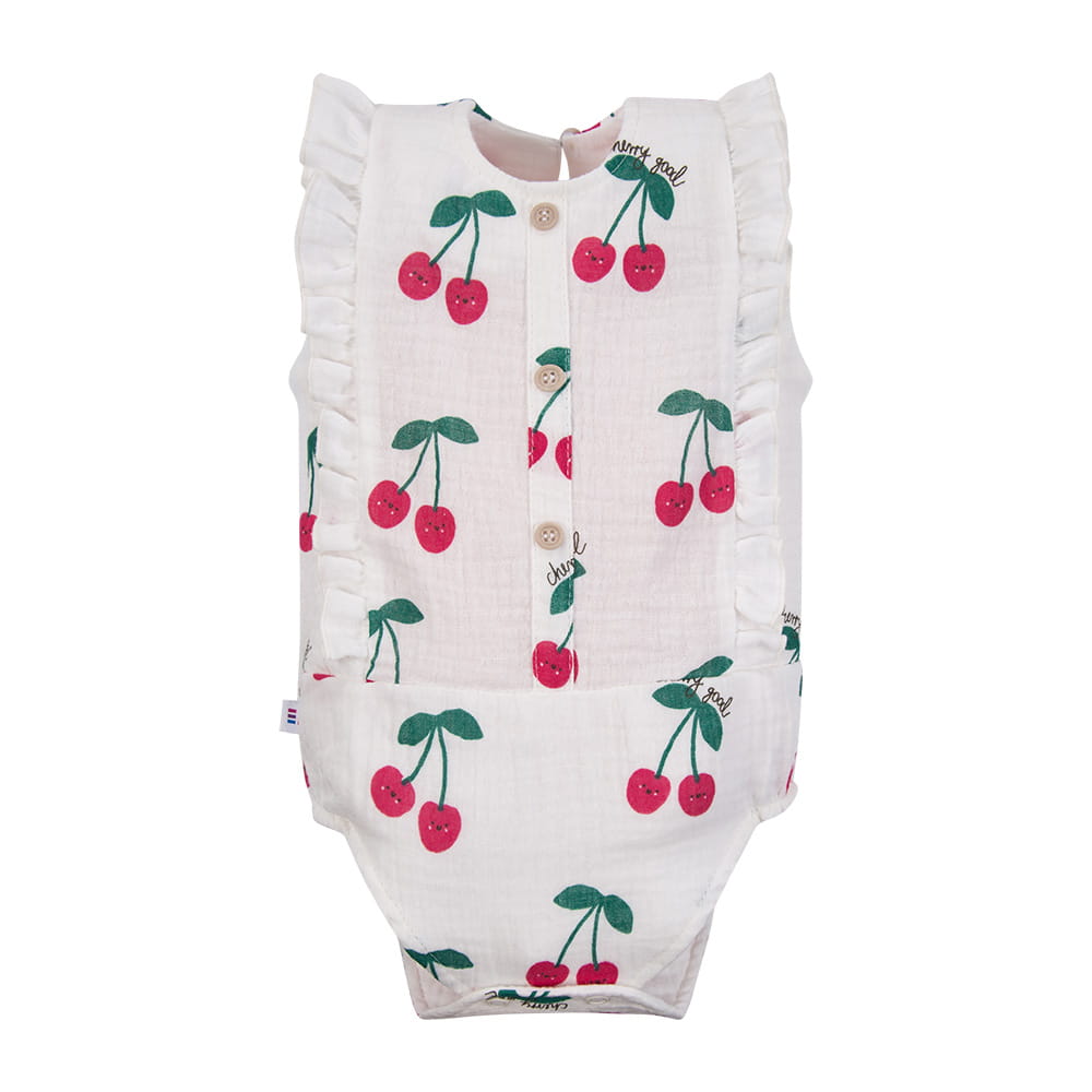 Měkké a prodyšné body pro dívky vyrobené ze 100% přírodní, měkké bavlněné mušelíny. Body je ecru s roztomilým potiskem třešní a má jemné volánky po stranách, které mu dodávají dívčí a elegantní charakter. Přední část je opatřena praktickým a estetickým zapínáním na knoflíky. Ideální na každodenní nošení a zároveň jako pohodlný a elegantní oděv pro hru a venkovní aktivity.