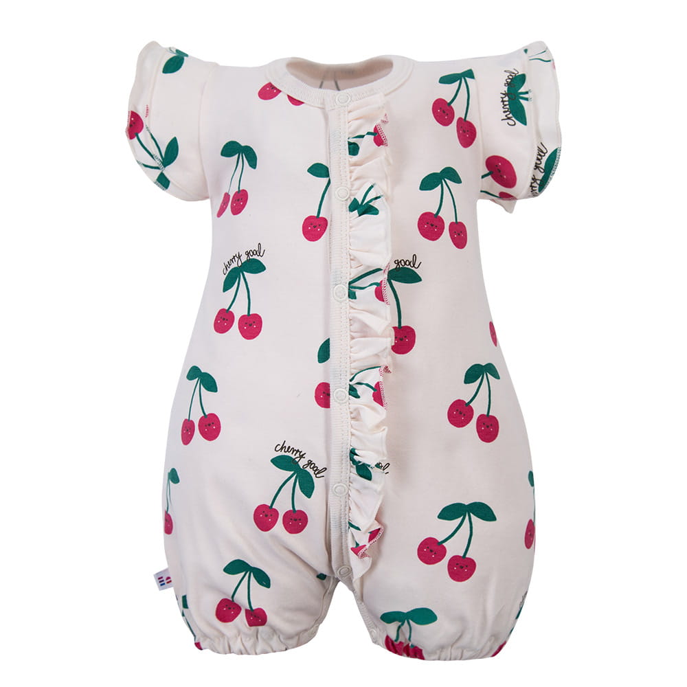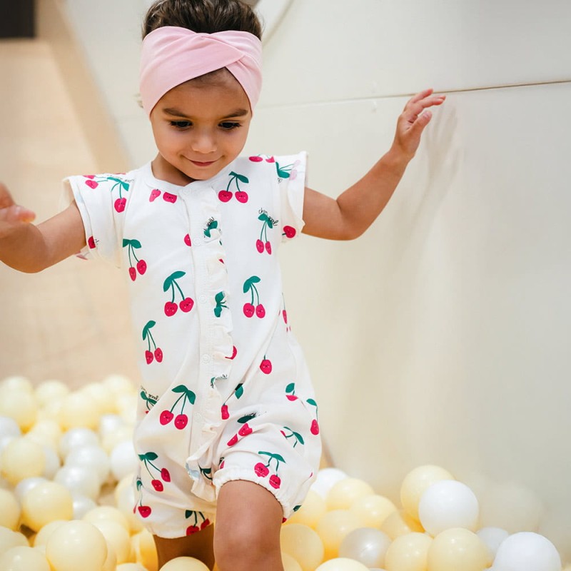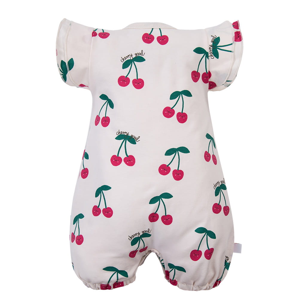 Stylový a pohodlný overal pro dívky vyrobený z měkkého a příjemného úpletu obsahujícího 95% bavlny a 5% elastanu. Overal se vyznačuje roztomilými motýlími rukávy a jemnou volánkovou lištou přes přední část, která mu dodává dívčí charakter. Jemná ecru barva s motivem třešní z něj činí ideální volbu pro každodenní nošení, a zároveň skvělou volbu na léto a prázdniny – zajišťuje pohodlí a volnost pohybu při hře a aktivitách na čerstvém vzduchu.