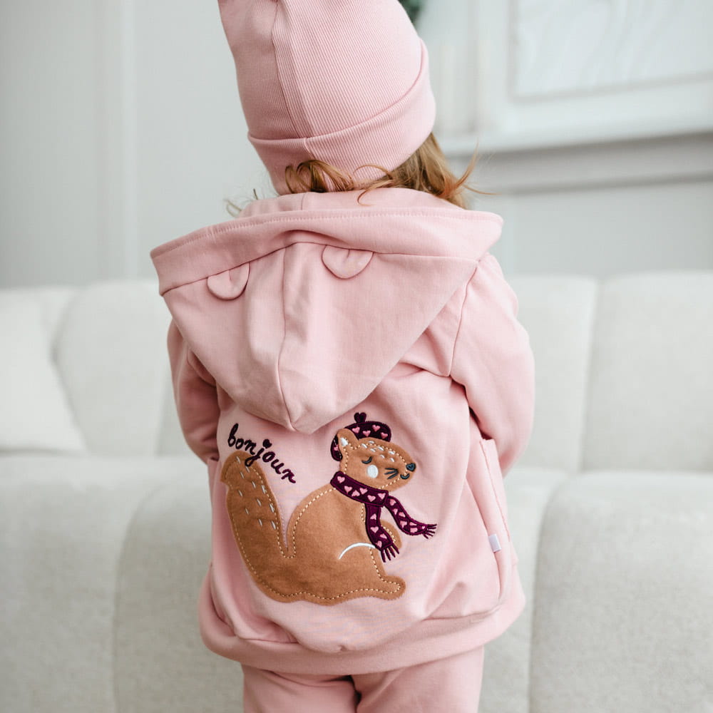 Dívčí růžová tepláková souprava s výšivkou veverky na zádech - Kolekce Fluffy Tails
