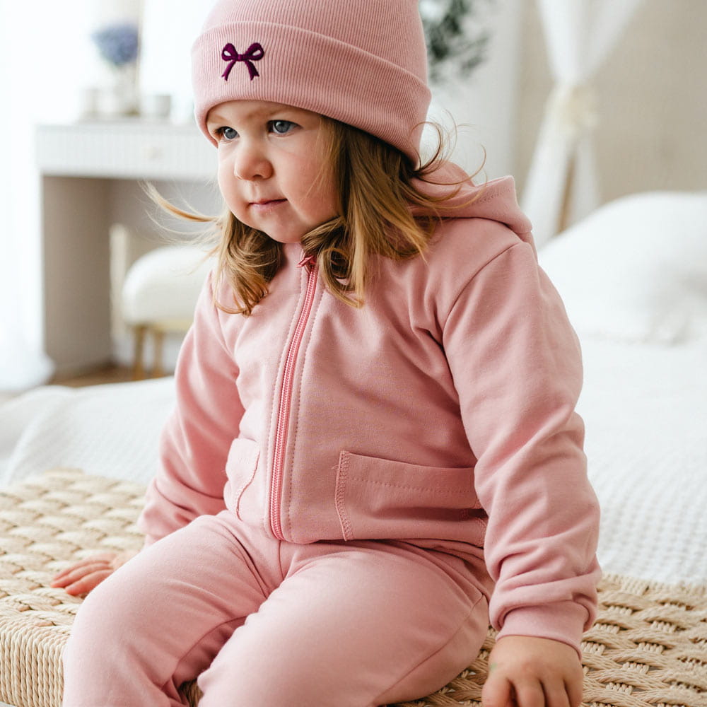 Růžová dívčí tepláková souprava z kolekce Fluffy Tails je měkký komplet na každý den - mikina s kapucí na zip a klasické tepláky. Hladká látka podtrhuje styl a výšivka veverky na zádech dodává roztomilý akcent. Ideální do školky, na procházky i domácí hraní.Proč zvolit dívčí teplákové soupravy od Eevi?