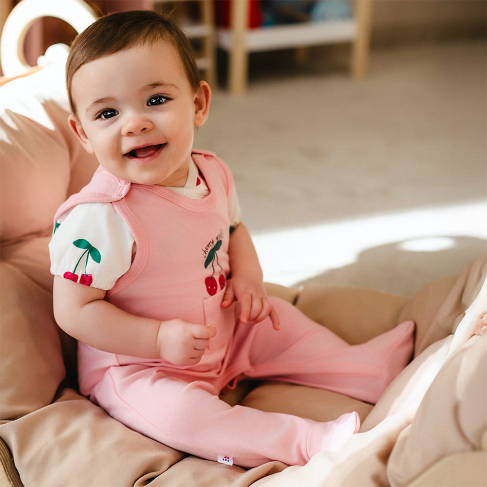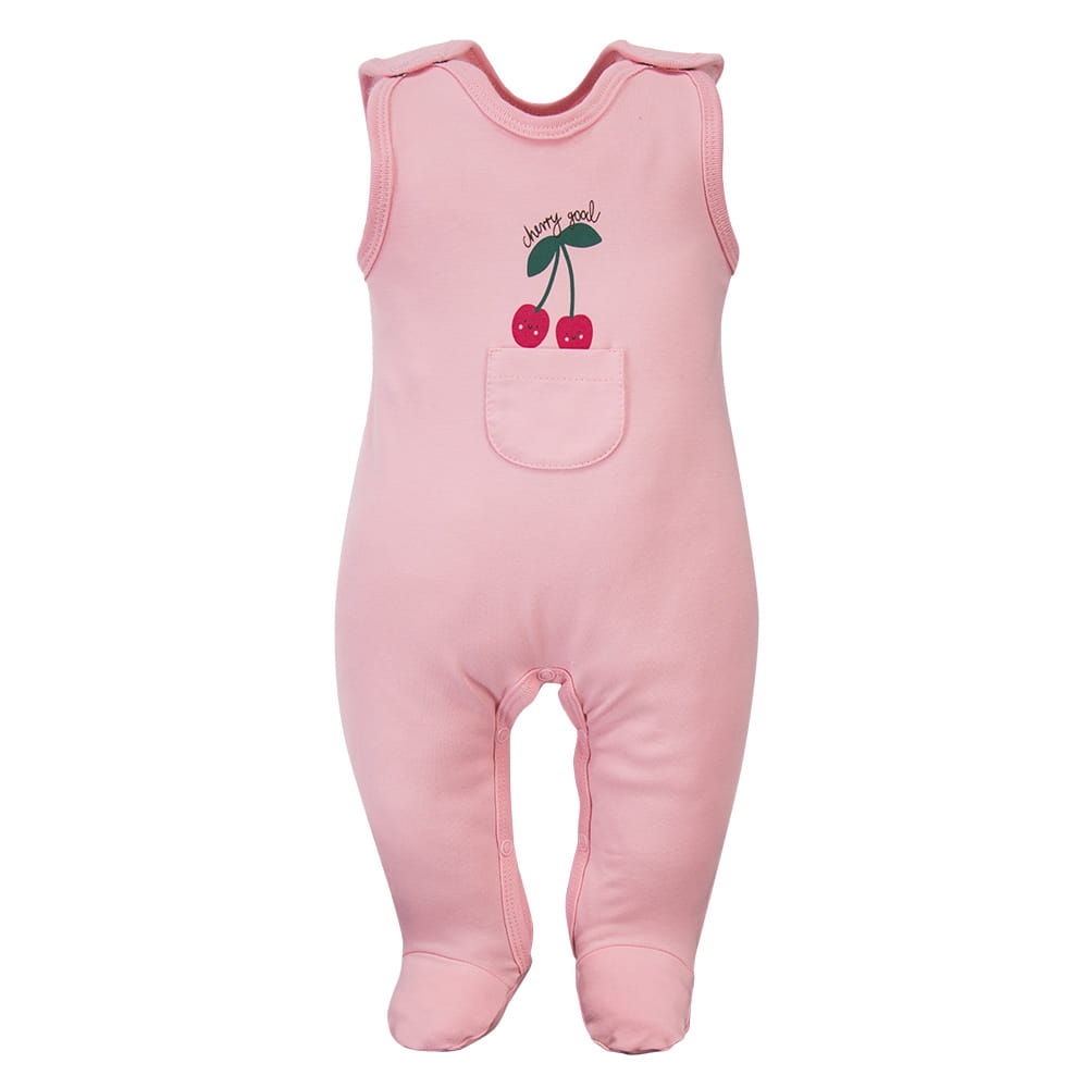 Měkké a pohodlné dupačky pro kojence vyrobené z materiálu obsahujícího 95% bavlny a 5% elastanu. Dupačky jsou světle růžové, uprostřed mají roztomilou kapsičku zdobenou potiskem usměvavých třešní, která jim dodává dívčí a radostný charakter. Měkký a pružný materiál zajišťuje pohodlí a volnost pohybu během každodenních aktivit.