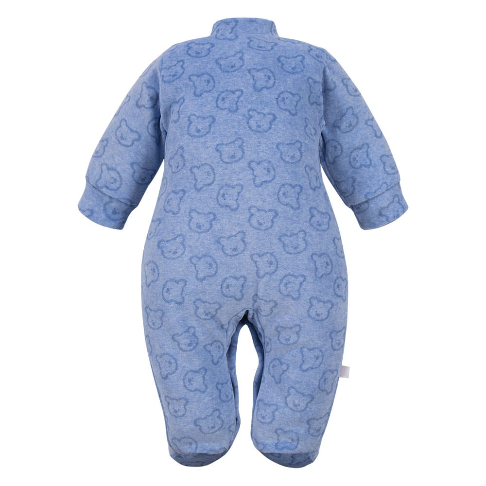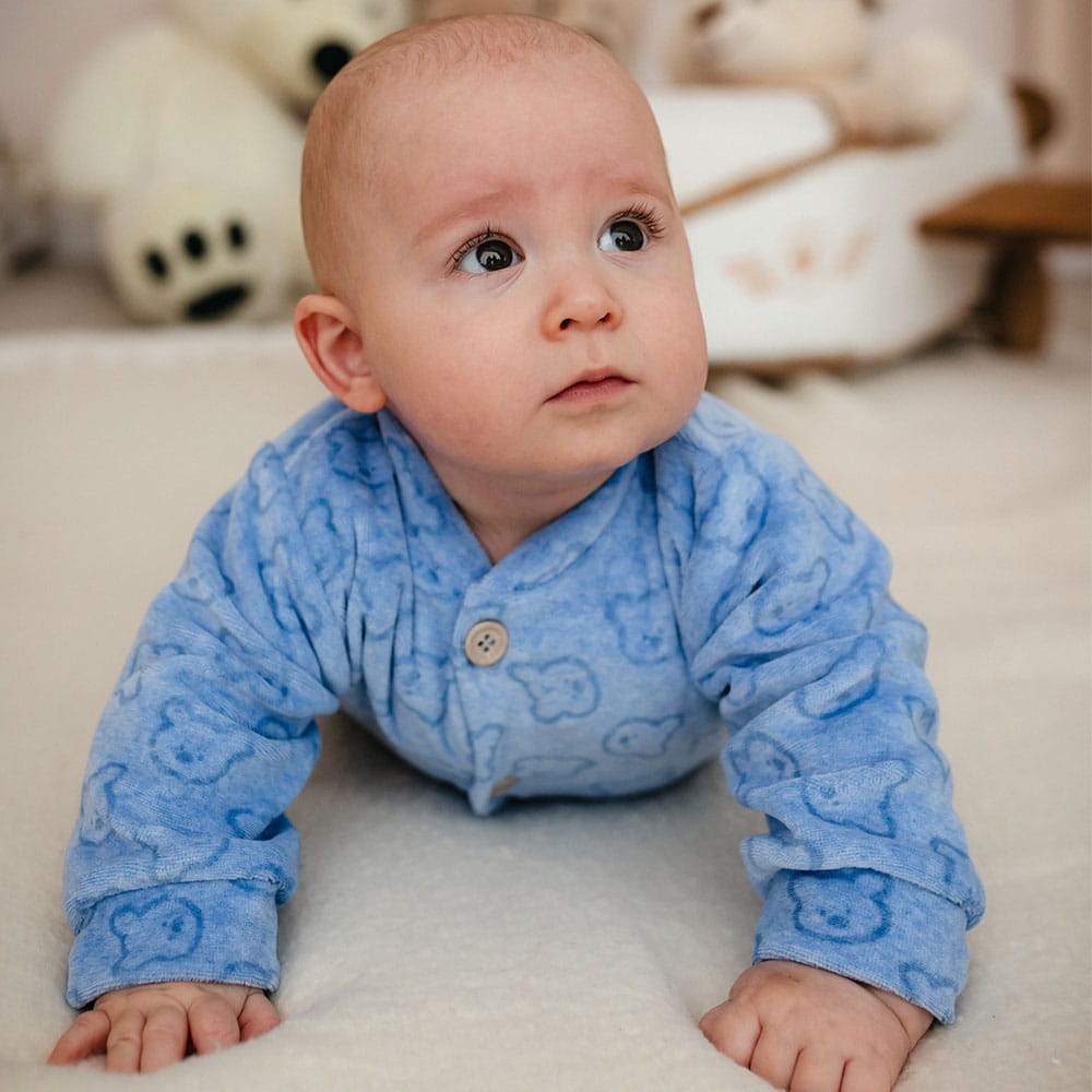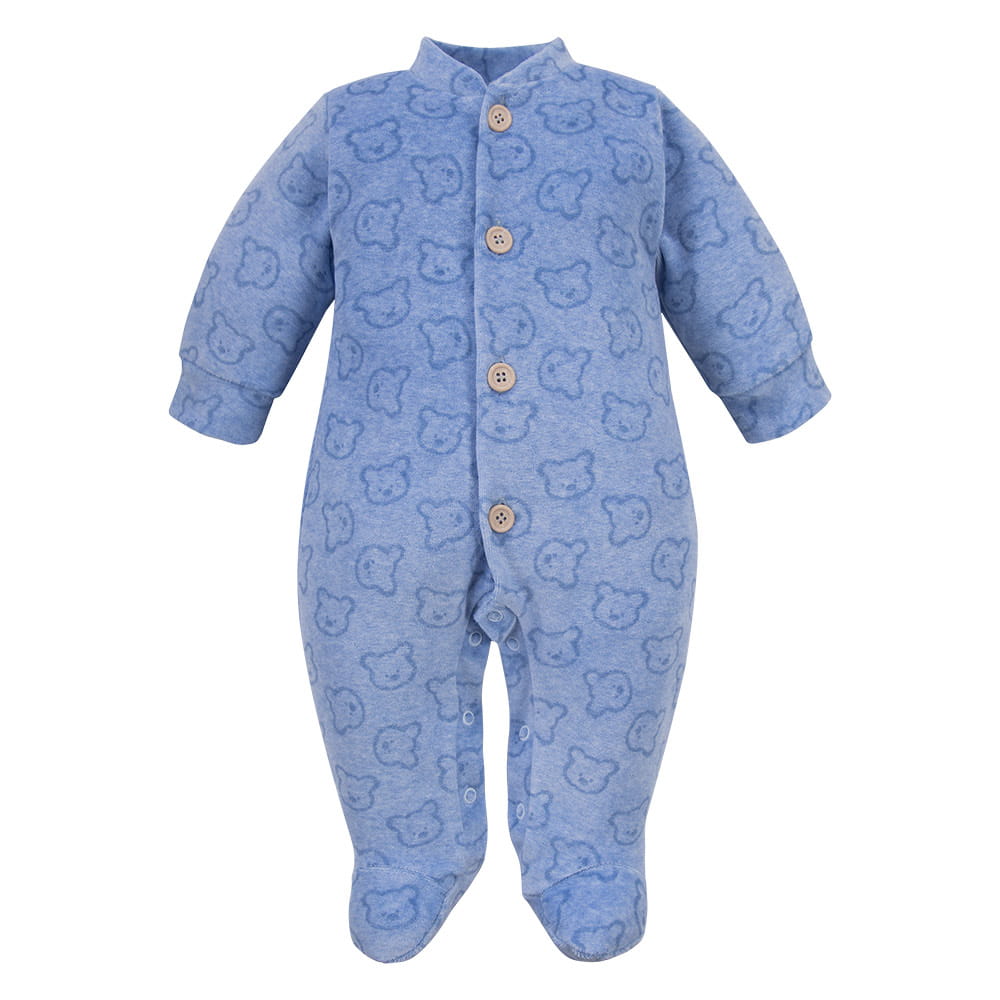 Kojenecký overal v modré barvě s roztomilým motivem medvídků je pohodlný a praktický oděv pro miminka. Je vyroben z měkkého veluru (80 % bavlna, 20 % polyester), který zajišťuje teplo a komfort pro citlivou dětskou pokožku. Zapínání na knoflíky a druky v rozkroku umožňuje snadné a rychlé přebalování.