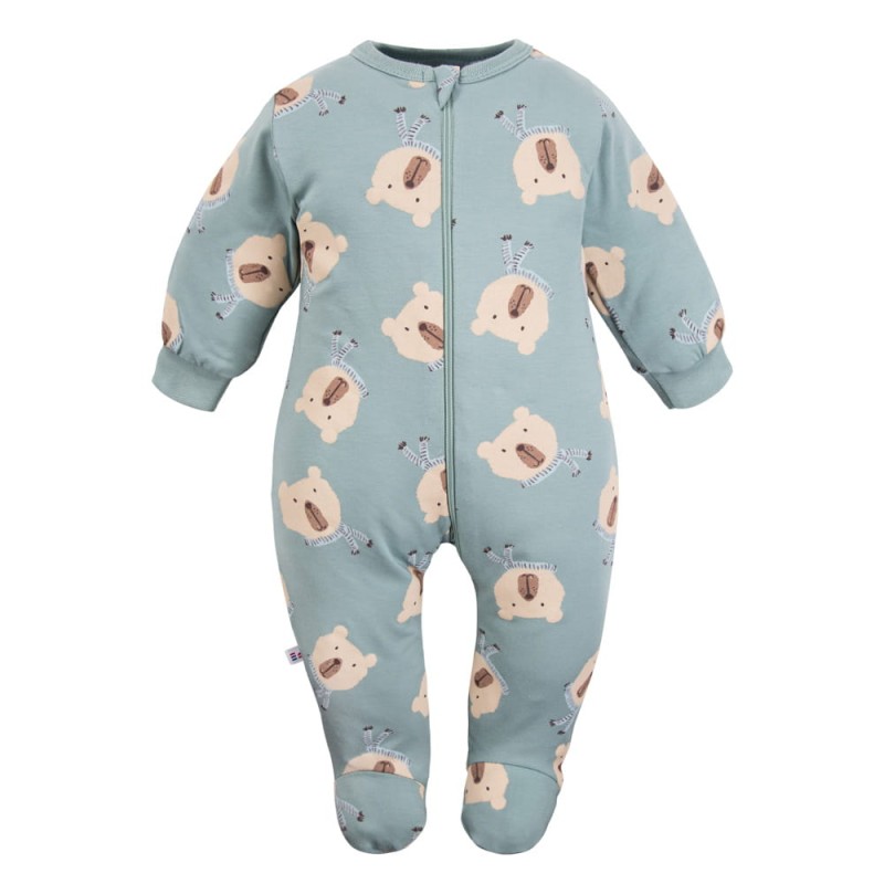 Kojenecký overal z kolekce Beary Cool je skvělou volbou pro novorozence a kojence od prvních dnů života. Je ušitý z měkké, prodyšné bavlny v módní šalvějové barvě s potiskem medvídků. Díky zabudovaným nožičkám poskytuje dodatečné teplo a pohodlí. Zip po celé délce usnadňuje rychlé přebalování miminka – dokonce i během spánku.