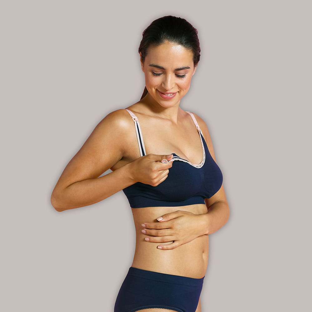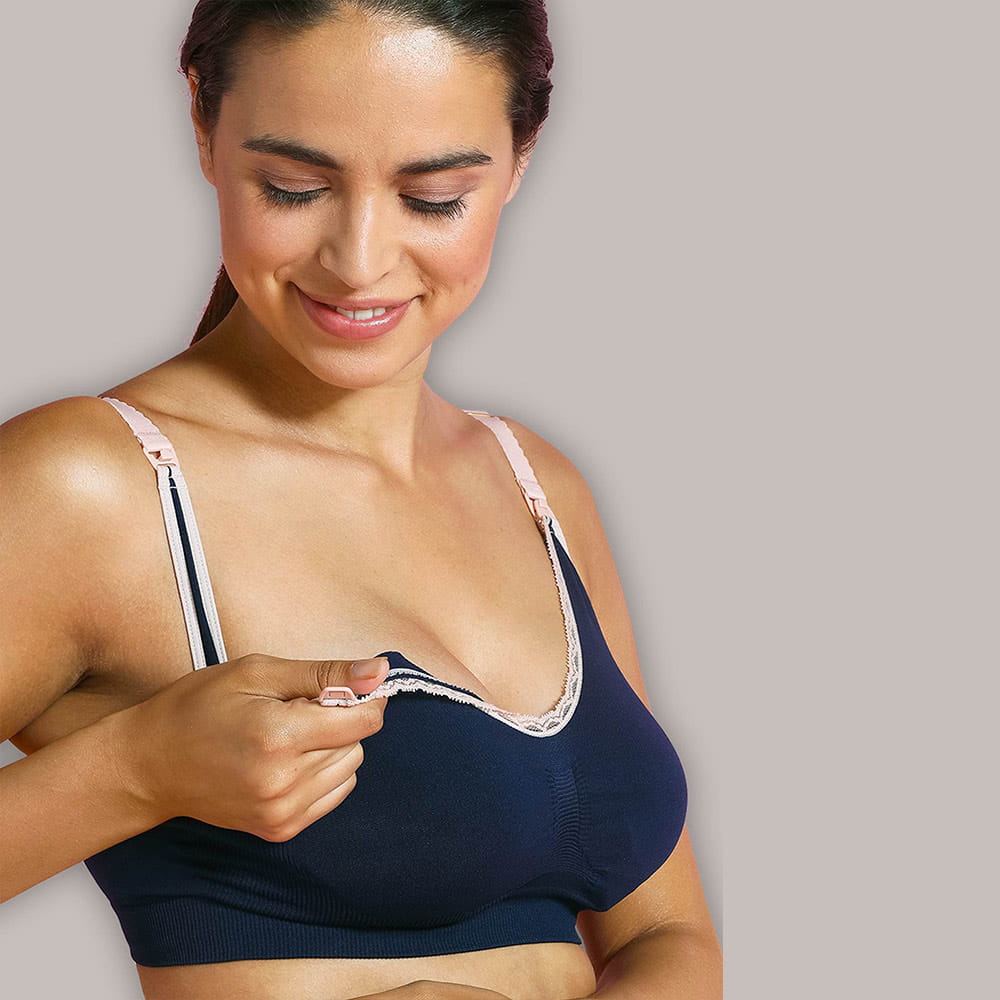Bezešvá kojicí podprsenka modrá s růžovou krajkou je ideální volbou pro pohodlné, bezpečné a praktické kojení – vhodná pro každodenní nošení během celého období těhotenství a kojení.