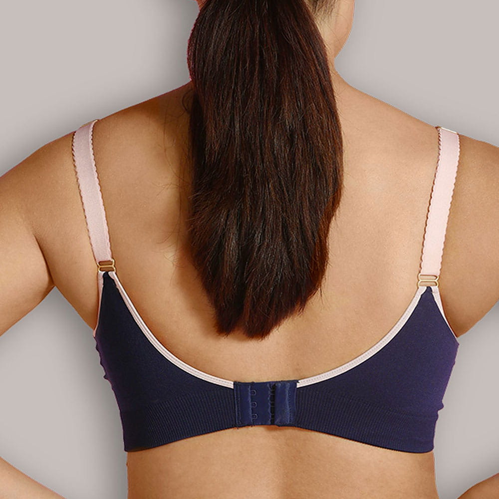 Bezešvá kojicí podprsenka modrá s růžovou krajkou – pohodlná a praktická