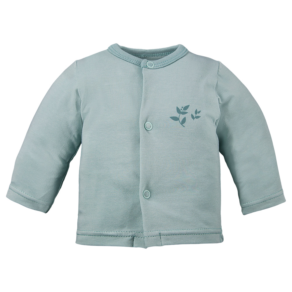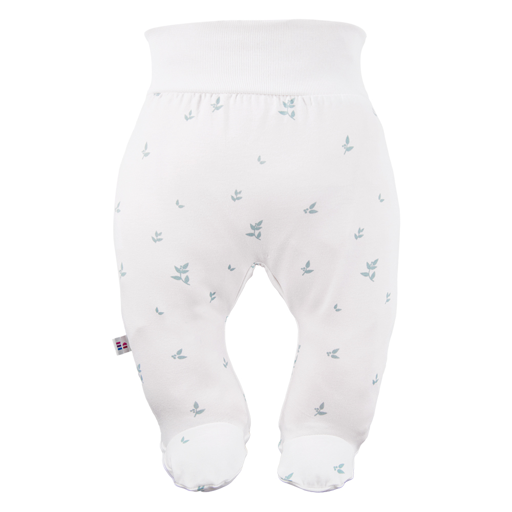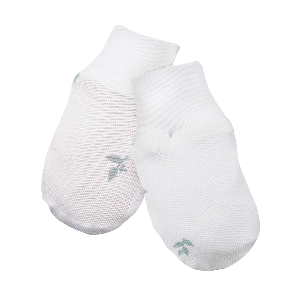 Barevnost v odstínech máty a bílé s jemným motivem lístků vytváří univerzální a nadčasovou výbavičku pro novorozence, ideální i jako dárek.