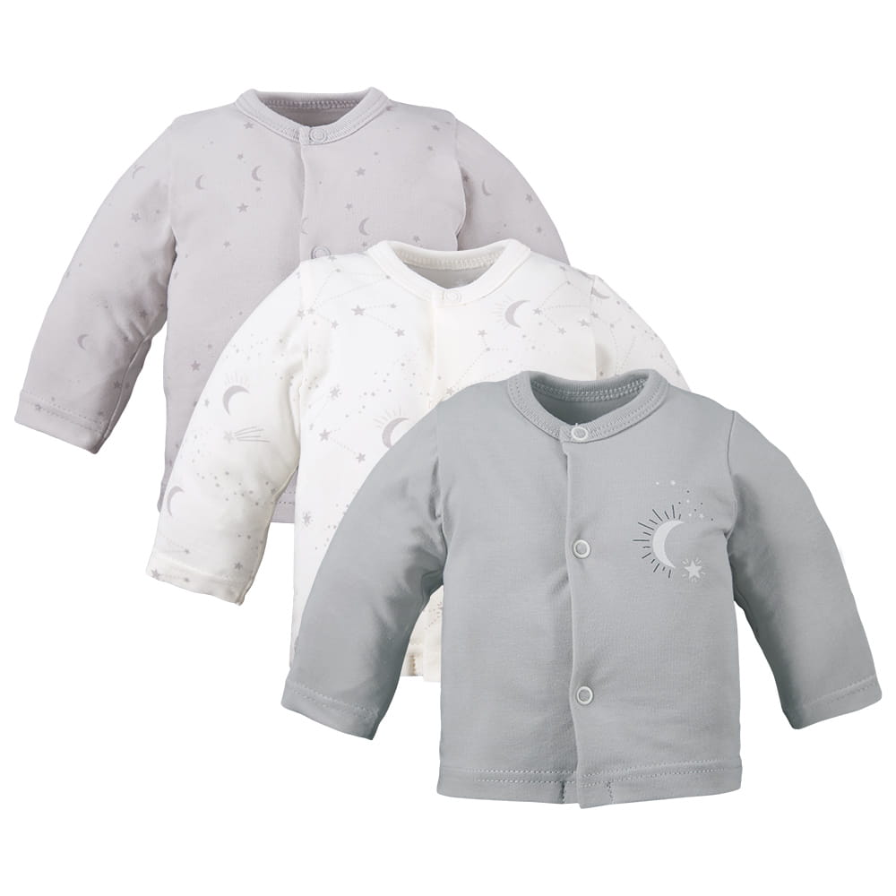 Sada obsahuje tři kabátky, které v kombinaci s dupačkami nebo polodupačkami vytvářejí funkční každodenní oblečení pro miminko. Jemný motiv hvězdiček dodává kabátkům kouzlo a dělá je něžnými a stylovými.