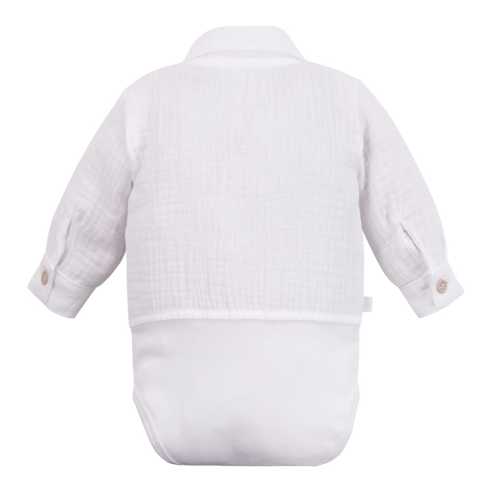 Košilové body z kolekce Ceremony v klasické bílé barvě je elegantní a pohodlná volba pro nejmenší. Ideální pro slavnostní příležitosti jako jsou křtiny, svatby nebo první svaté přijímání a spojuje vzhled košile s pohodlím body.