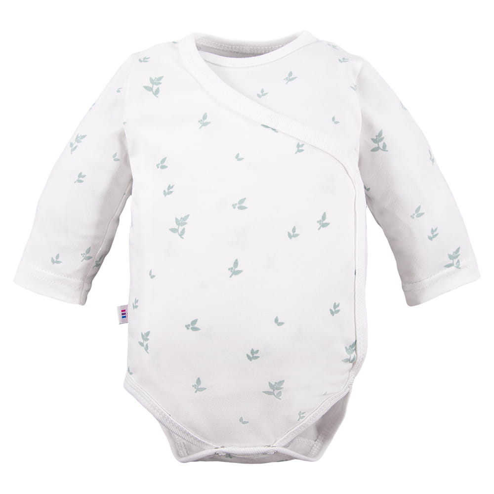 Bílé dlouhý rukáv zavinovací body s jemnými zelenými lístky je funkční a pohodlnou volbou pro první měsíce života dítěte. Jemný vzor dodává body přátelský a elegantní vzhled.