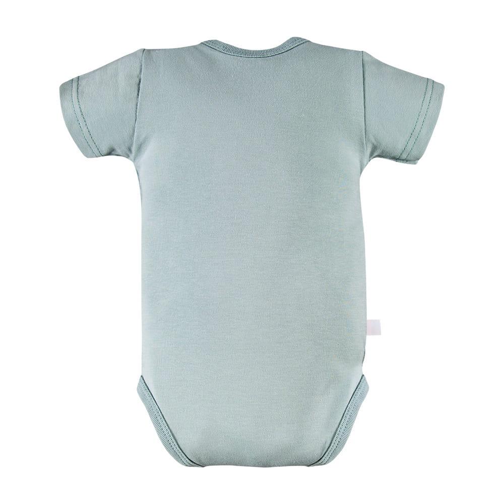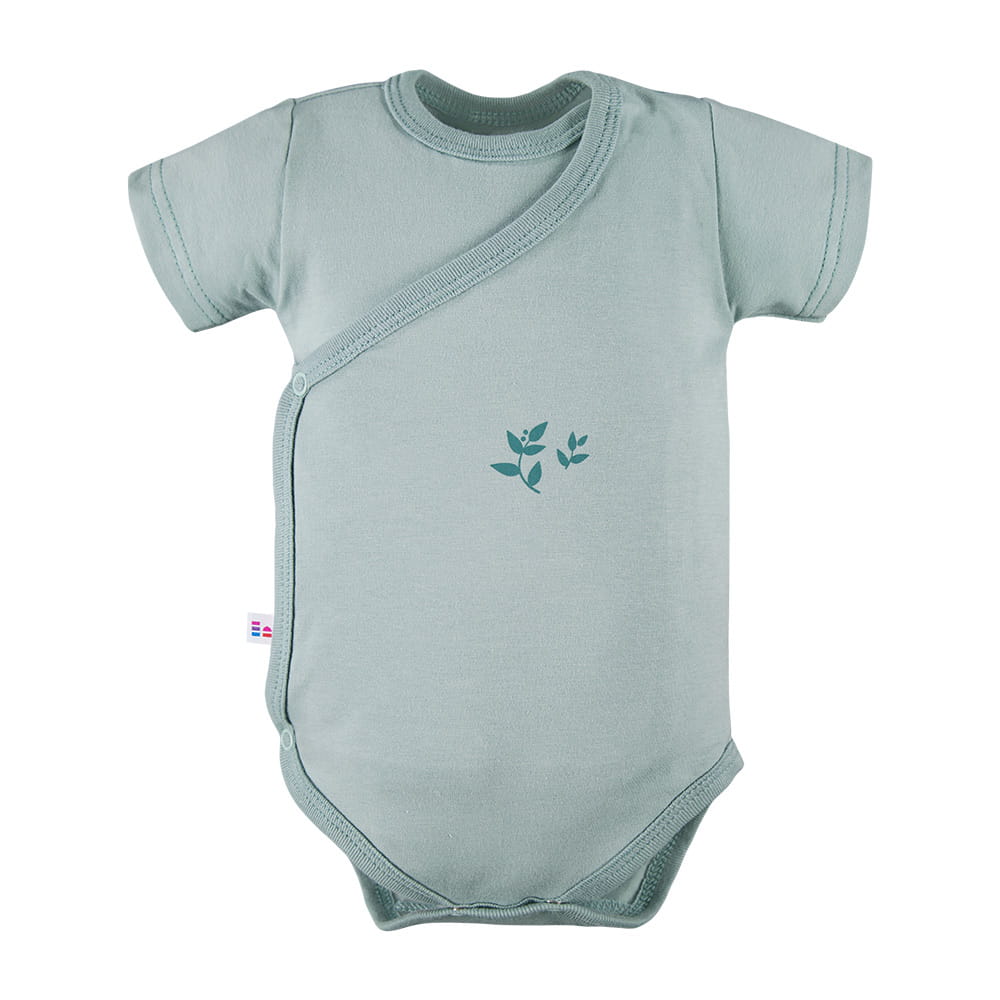 Zelené zavinovací dětské body s krátkým rukávem s motivem lístků je pohodlná a praktická volba pro miminka v prvních měsících života. Jemný listový vzor dodává oblečení decentní, přírodní vzhled.