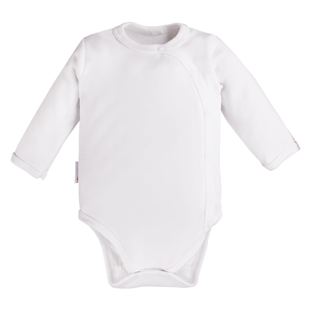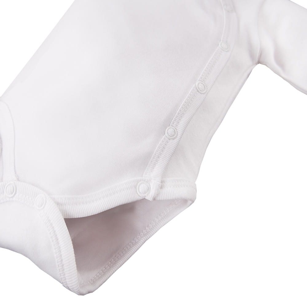 Soft, wrap-style bodysuit with long sleeves is an excellent choice for the youngest children – from the first days of life. Made from high-quality, pleasant-to-touch white cotton knit, it ensures wearing comfort and complete freedom of movement. Thanks to the possibility of complete opening, the garment is exceptionally practical – it facilitates changing, without the need to pull over the head. Finished with delicate binding that protects the skin from chafing. The nickel-free snaps used are safe even for allergy sufferers.