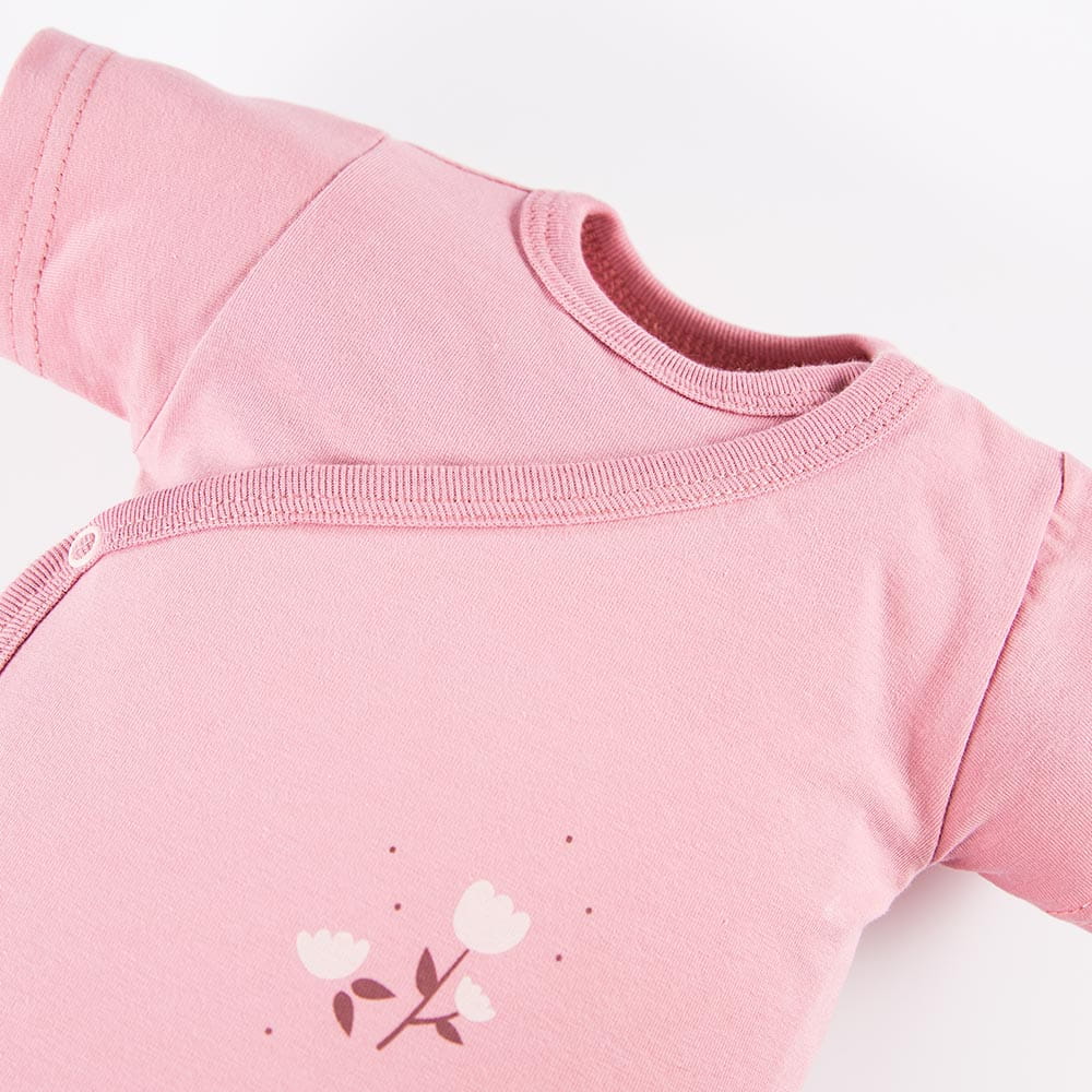 Set of 3 wrap bodysuits in shades of pink and cream with a delicate flower pattern is the perfect choice for the first months of a baby's life. Wrap bodysuits are one of the most popular items in a baby’s wardrobe – comfortable, practical, and highly functional.