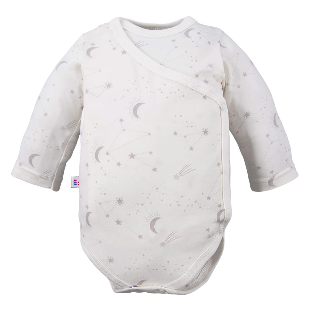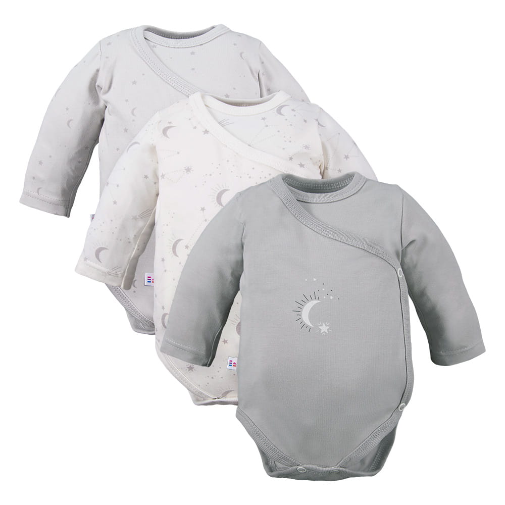 Set of 3 wrap bodysuits in subtle ecru and shades of grey with a cute star pattern is a perfect choice for the first months of your baby’s life. Wrap bodysuits are the most popular choice among parents and are an absolute must-have in every baby layette.