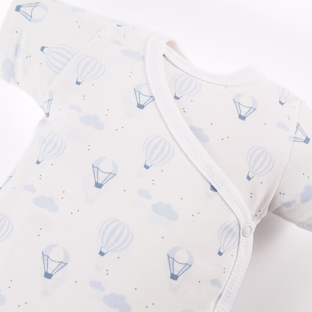 White wrap baby bodysuit with short sleeves featuring balloons is a comfortable and practical choice for infants in their first months. The delicate balloon pattern gives the outfit a cheerful, childlike charm.