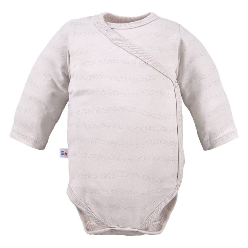 Beige wrap-style baby bodysuit with long sleeves and a delicate all-over print is a practical and exceptionally comfortable wardrobe essential for infants. Thanks to the wrap design, the bodysuit can be fully unfastened along its entire length, making dressing and diaper changes much easier – especially during the first months of life.