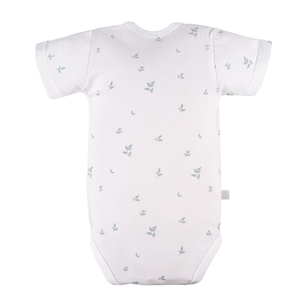 White wrap baby bodysuit with short sleeves featuring delicate green leaves is a comfortable and practical choice for infants in their first months. The subtle leaf pattern gives the outfit a friendly, childlike charm.