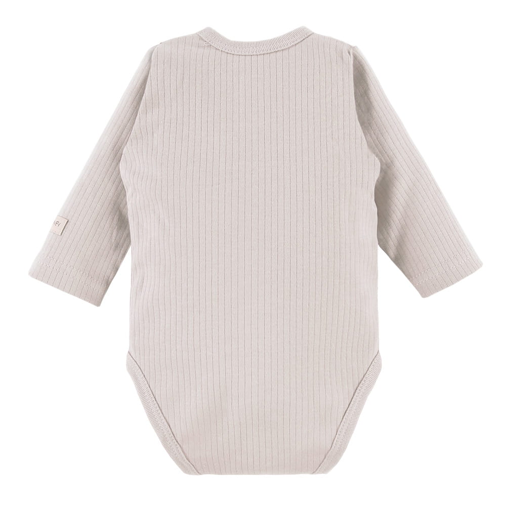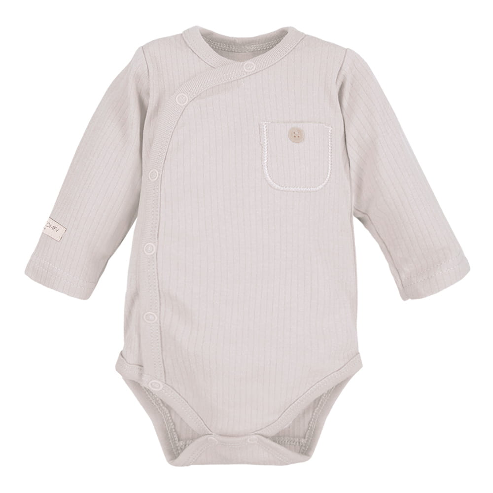 Baby bodysuit with a pocket from the "Simply Comfy" collection, made from soft and pleasant-to-the-touch cotton knit fabric with stripes. The front of the infant bodysuit features a charming pocket with a button. The design allows for full-length unfastening, making the bodysuit functional and comfortable. The bodysuit is finished with a soft binding. Baby bodysuits are ideal for the first months of a baby's life and are among the most commonly chosen items by moms.